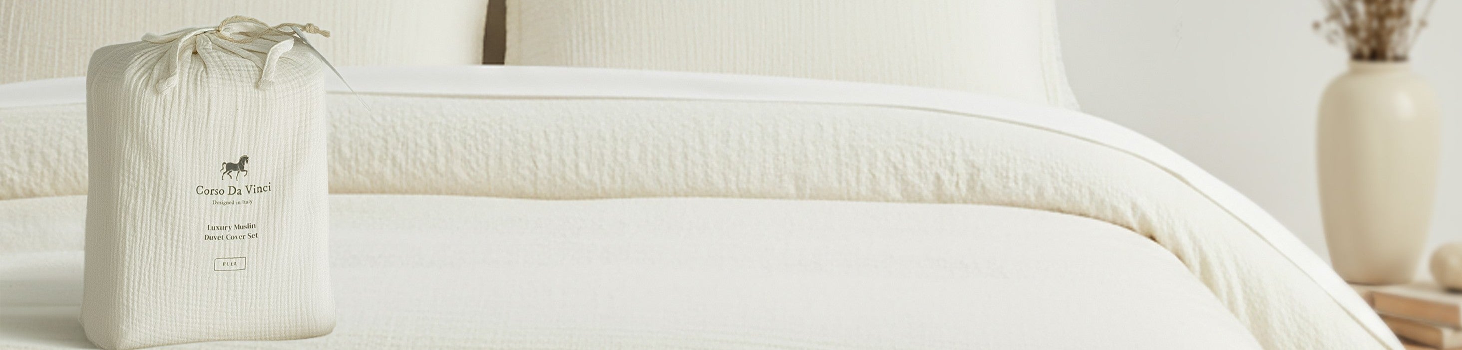 Carefully crafted with four layers of breathable cotton muslin, this duvet set is designed to provide an airy, cooling effect in the summer and cozy warmth in the winter, ensuring your comfort through every season.